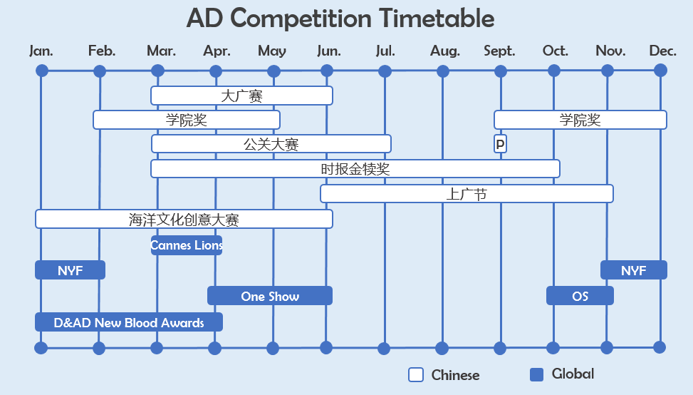 Campaign:本次FYP campaign类别相较往年有所改变,学生无需等待来年春季的学院奖公布选题,可自行选择2021年9月至2022年3月内公布的国内外公关广告营销类竞赛的选题,与导师确认选题后即可开始着手准备FYP。部分竞赛时间表可参考以下图片。